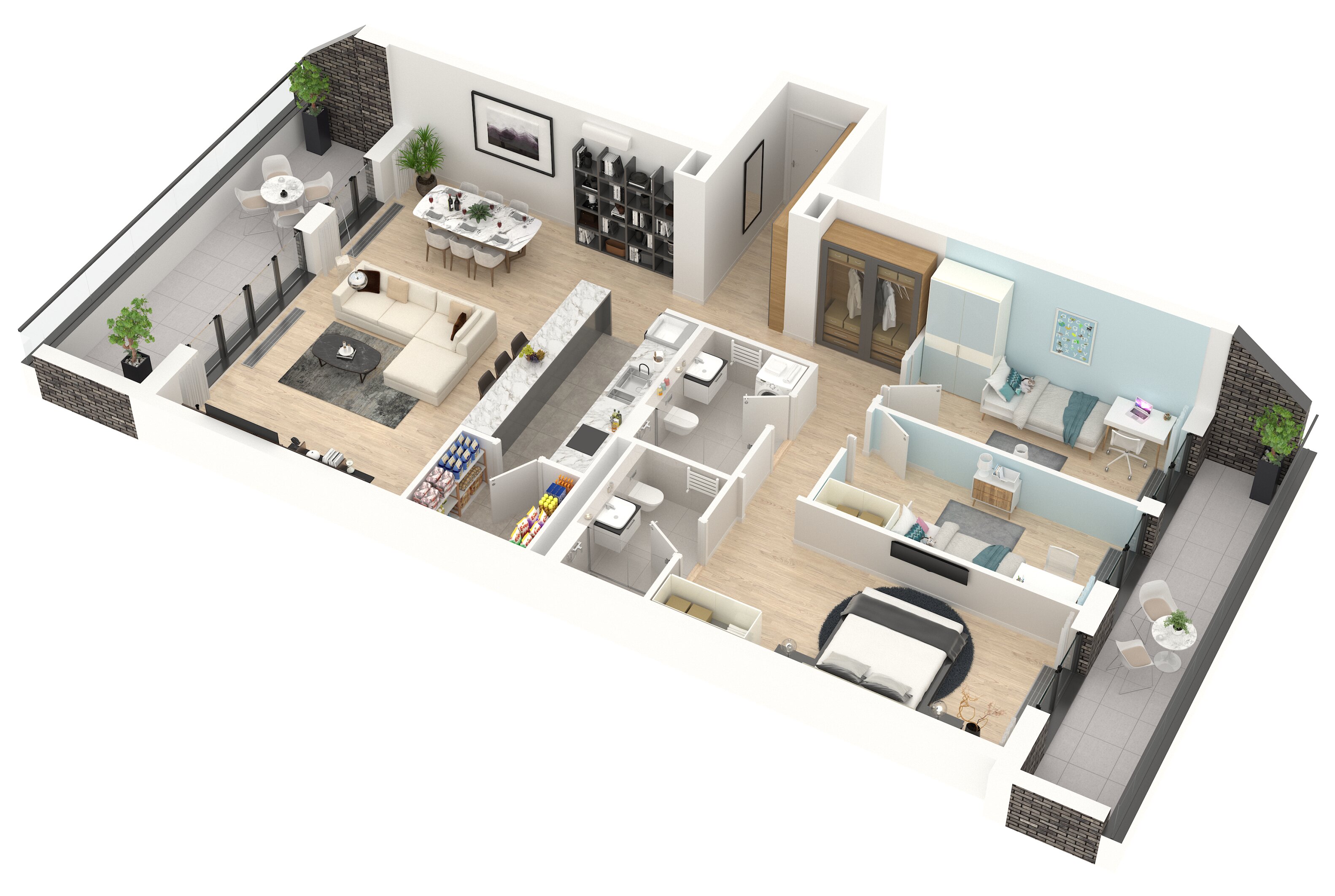 Цртежи тродимензионалног приказа и основе стана су направљени у маркетиншке сврхе. Стварне димензије и површине приказаних просторија и стана могу варирати. Намештај и опрема ентеријера стана нису предмет продаје и нису урачунати у цену стана.