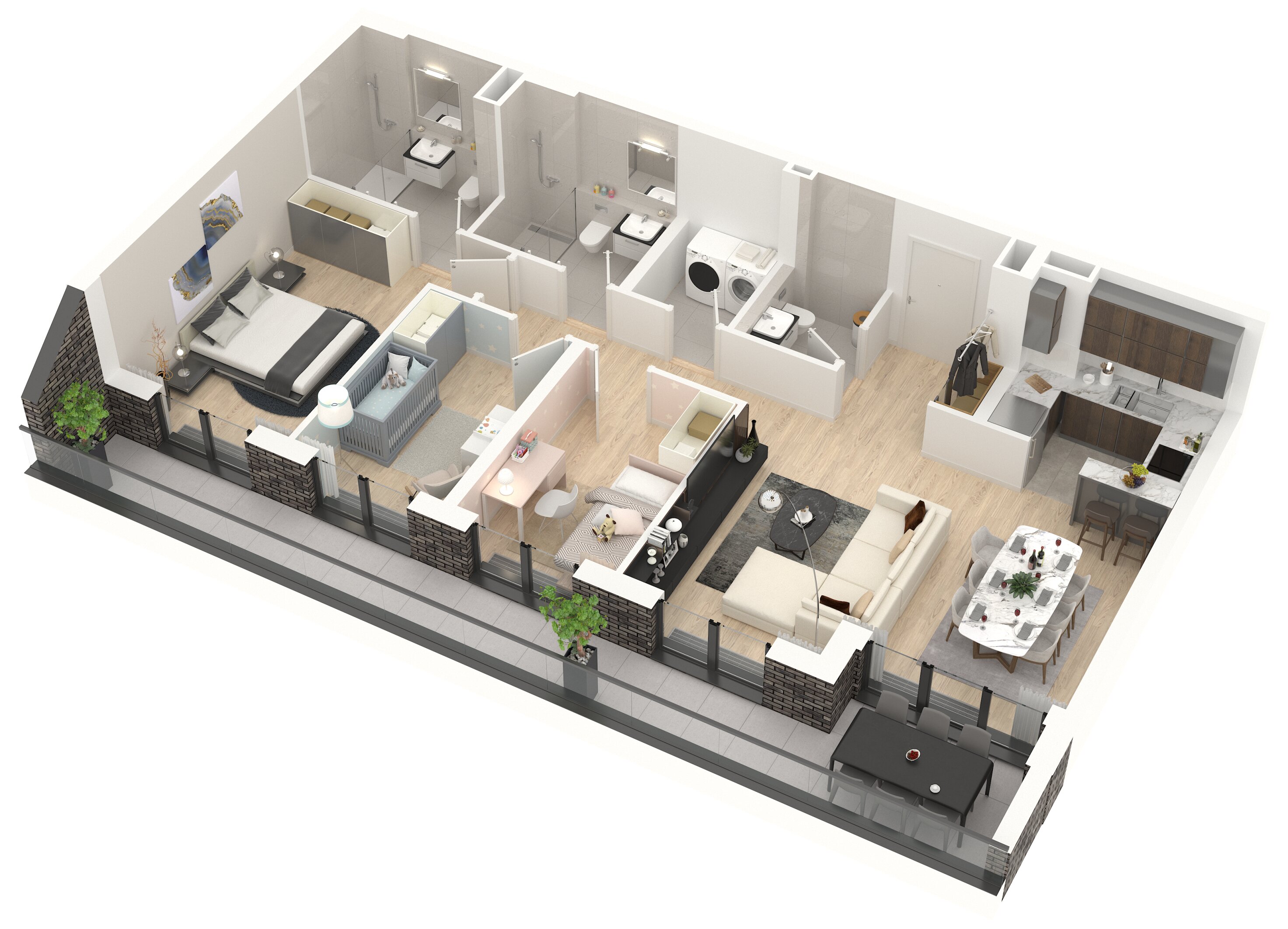 Цртежи тродимензионалног приказа и основе стана су направљени у маркетиншке сврхе. Стварне димензије и површине приказаних просторија и стана могу варирати. Намештај и опрема ентеријера стана нису предмет продаје и нису урачунати у цену стана.