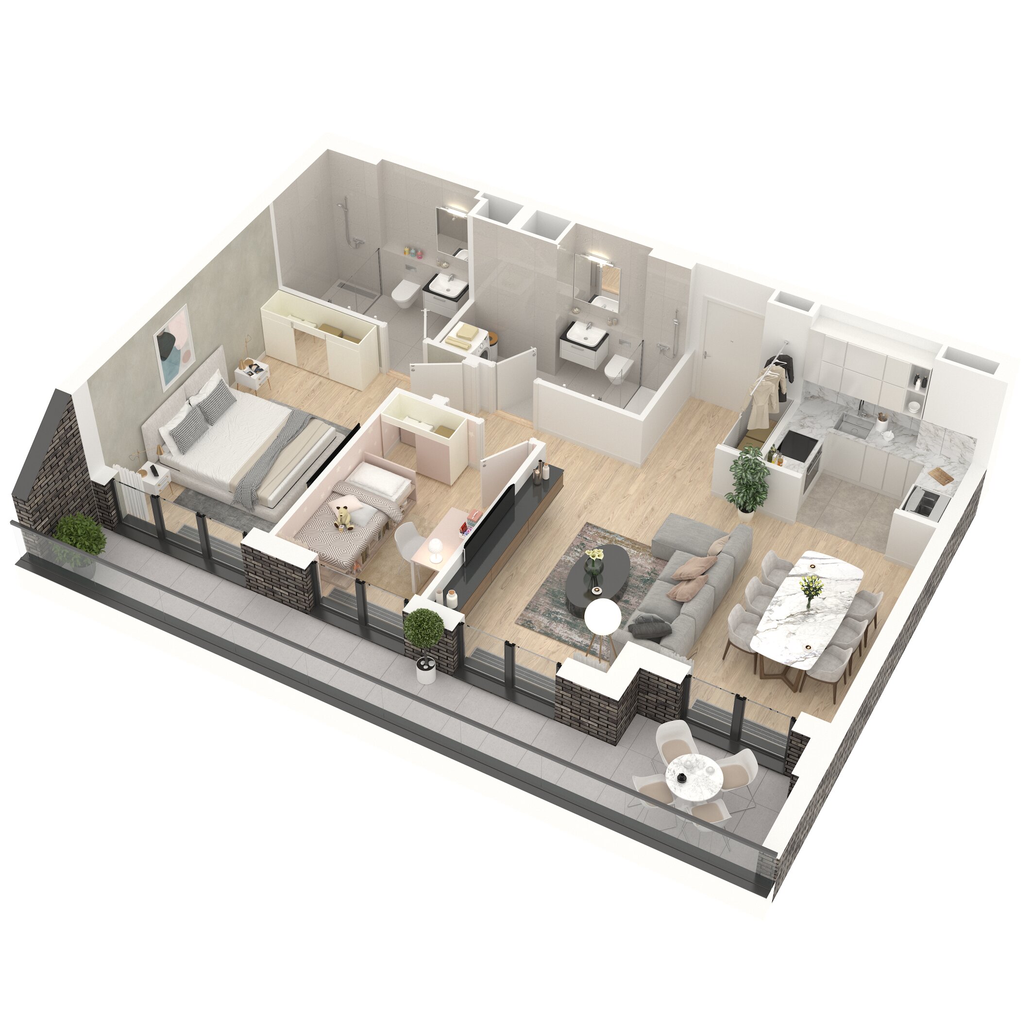 Цртежи тродимензионалног приказа и основе стана су направљени у маркетиншке сврхе. Стварне димензије и површине приказаних просторија и стана могу варирати. Намештај и опрема ентеријера стана нису предмет продаје и нису урачунати у цену стана.