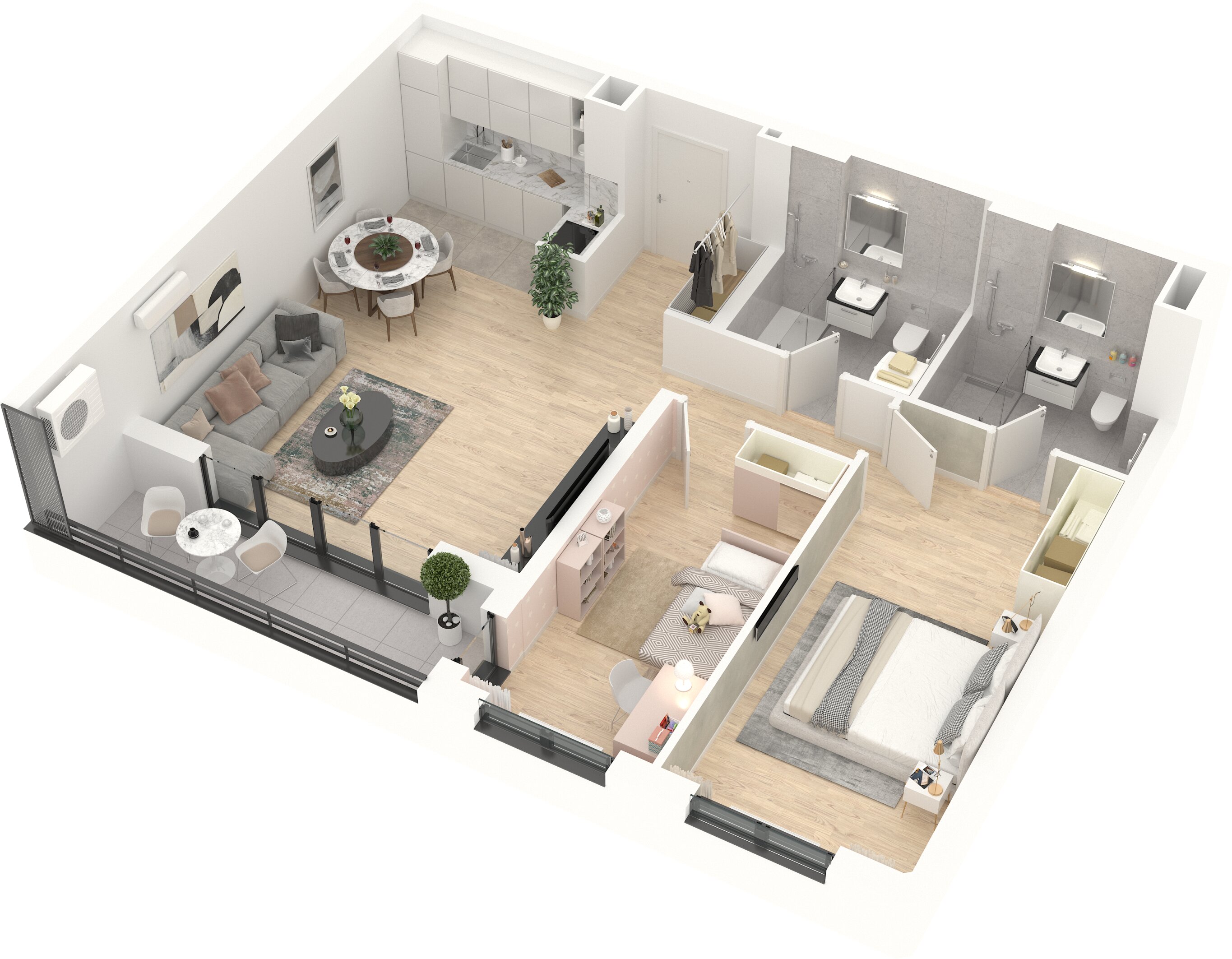 Цртежи тродимензионалног приказа и основе стана су направљени у маркетиншке сврхе. Стварне димензије и површине приказаних просторија и стана могу варирати. Намештај и опрема ентеријера стана нису предмет продаје и нису урачунати у цену стана.