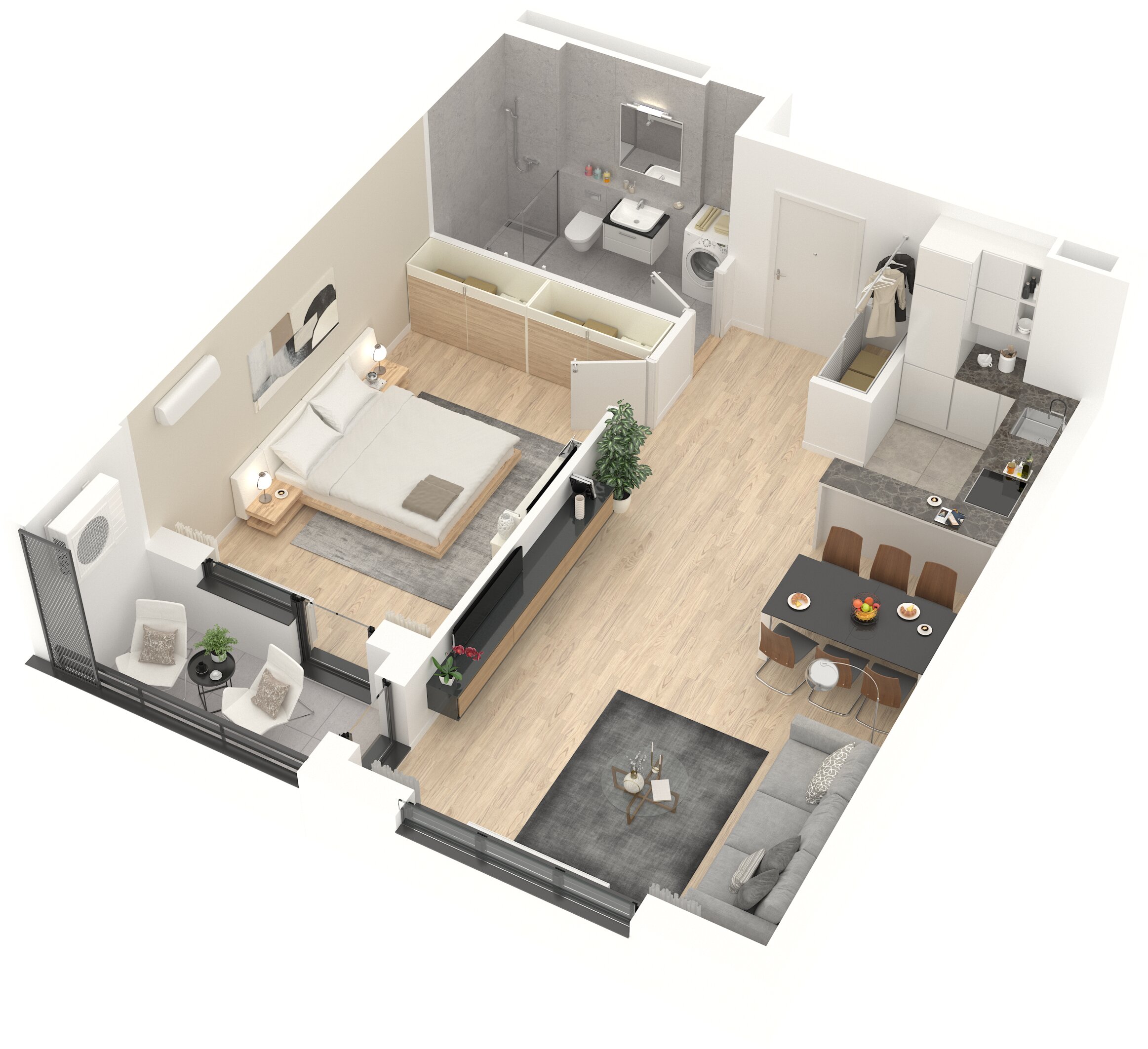 Цртежи тродимензионалног приказа и основе стана су направљени у маркетиншке сврхе. Стварне димензије и површине приказаних просторија и стана могу варирати. Намештај и опрема ентеријера стана нису предмет продаје и нису урачунати у цену стана.